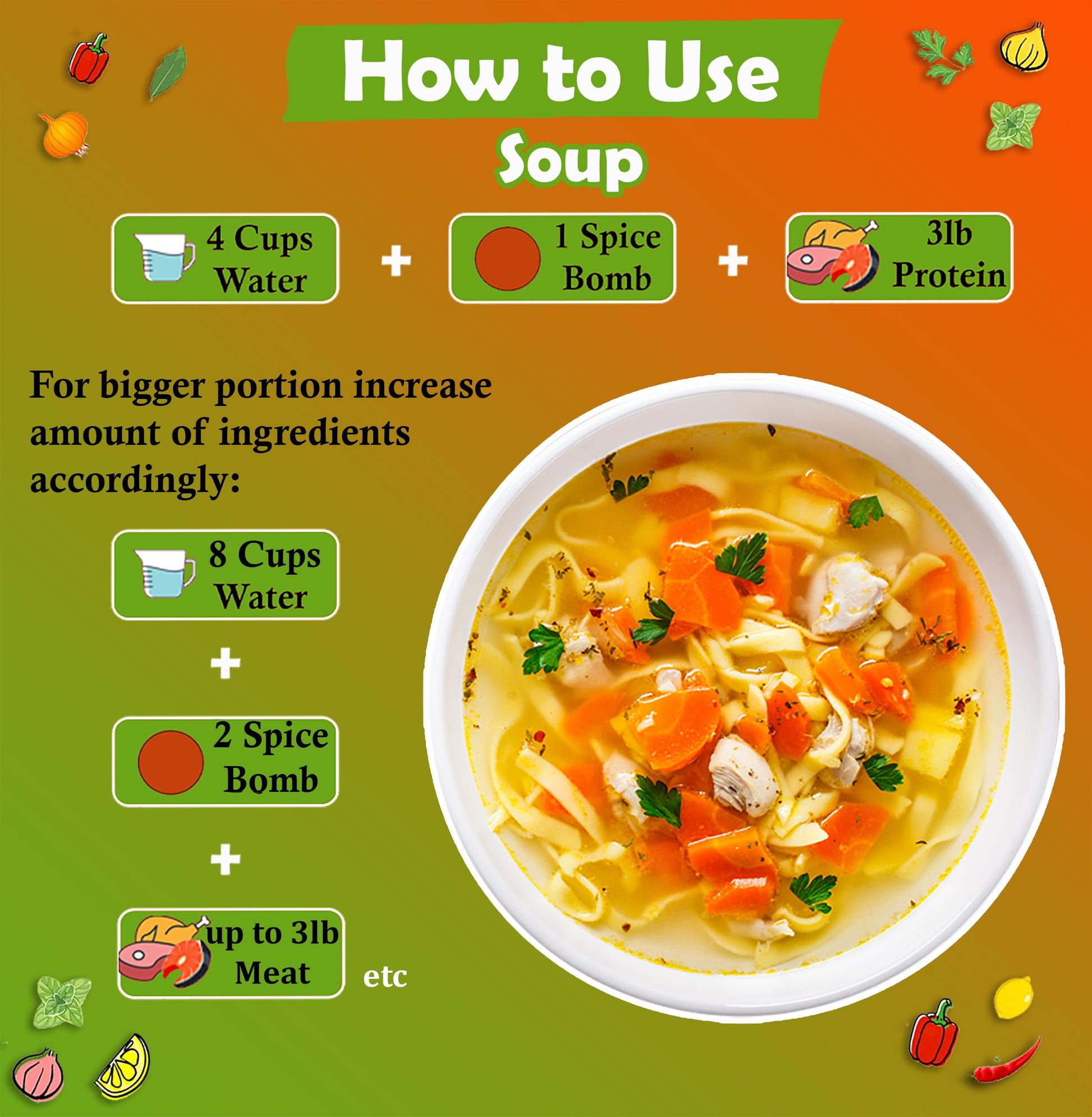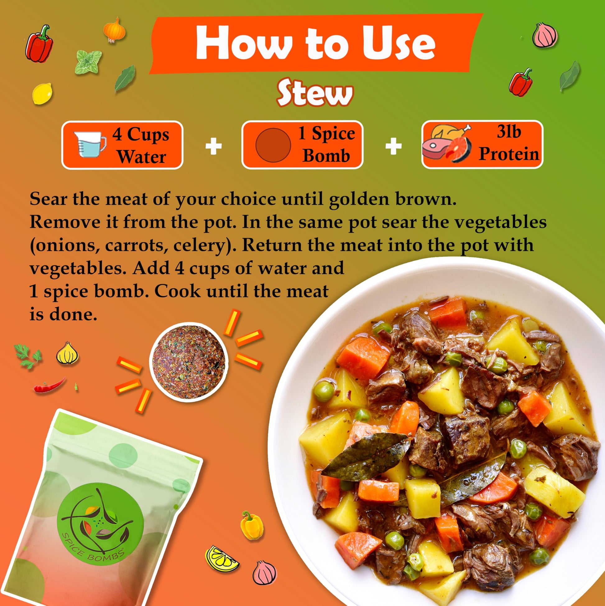 - Versatile. Transform your meals with Universal Spice Bombs, versatile seasoning blend, great for soups, stews and marinades. Make delicious birria, tacos, fajitas, kebabs, gyros, pot roast etc. One Spice Bomb is good for 2-3 lb of meat and can serve 4-6 people. Whether you're grilling, sautéing, or baking, Spice Bombs will add a punch of flavor that makes every bite unforgettable.