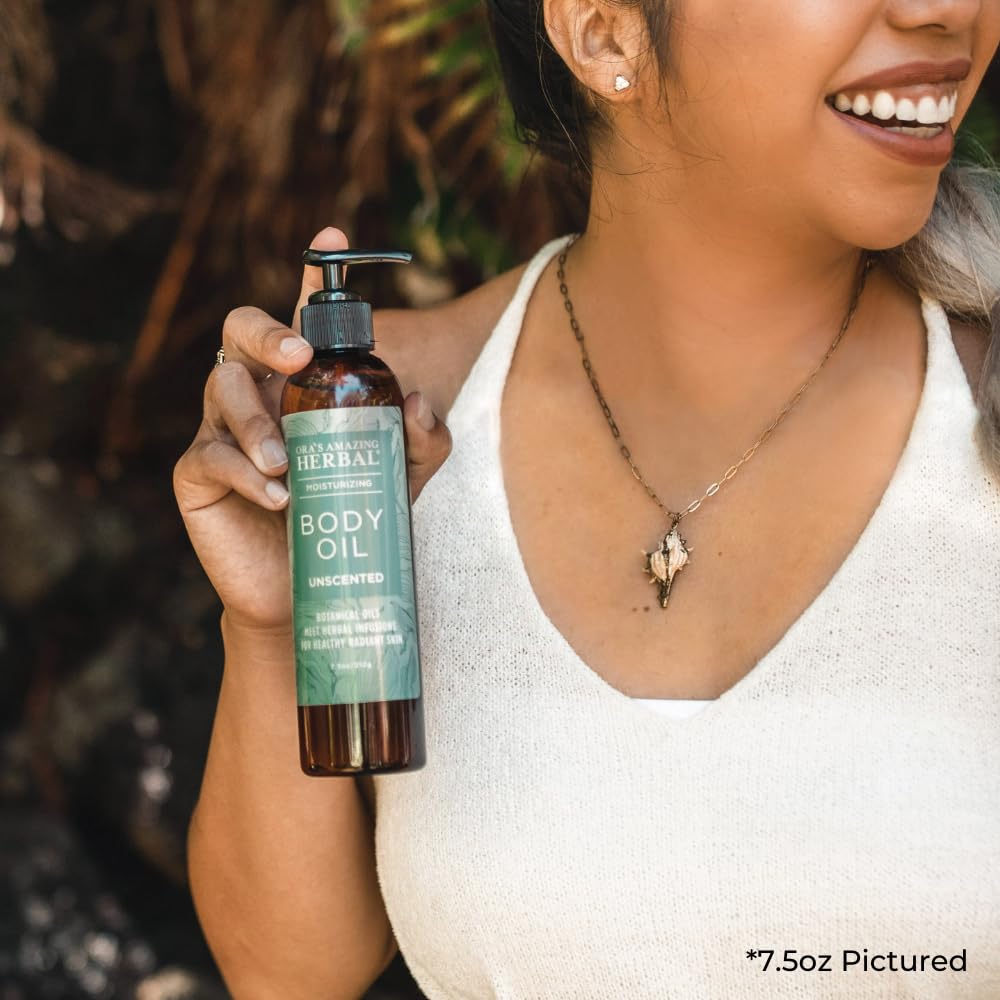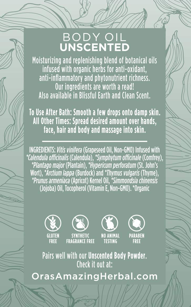 - Unscented Body Oil smells Amazingly simple and clean while supporting optimal skin health. We love this product because it is moisturizing, nourishing and contains botanicals known to be healing skin oils and herbs.