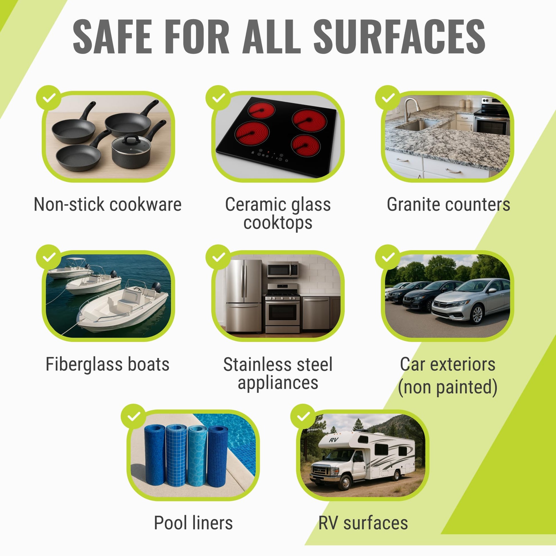 - Chemical-Free: Clean with just water and soap, replacing harsh chemicals. Safe for kitchen appliances, RVs, boats, pools, and even removing road tar from cars without damage.