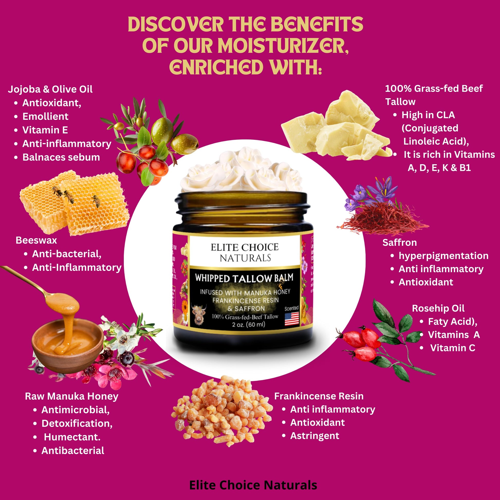 - ALL-NATURAL, CHEMICAL-FREE MOISTURIZER: Made with 100% grass-fed beef tallow, infused with raw Manuka honey, saffron, frankincense resin, and organic oils like jojoba, rosehip, and olive oil. Hydrates and nourishes all skin types, especially Aging Skin with Wrinkles.