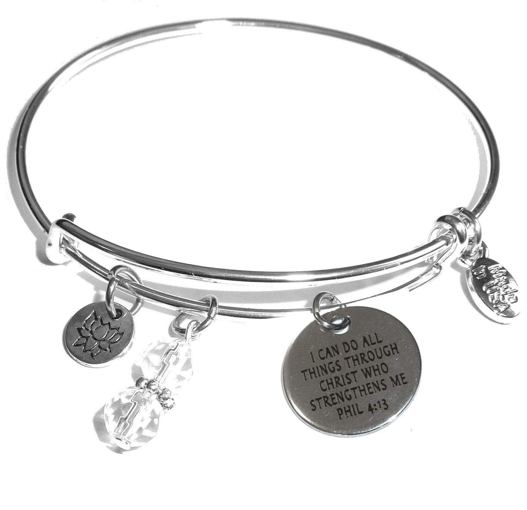 Women's Made In USA Stainless Steel Message Charm Expandable Wire Bangle Bracelet, Popular, Stylish and Trendy, Arrives in a Gift Bag. (I can do all things through Christ who strengthens me)
