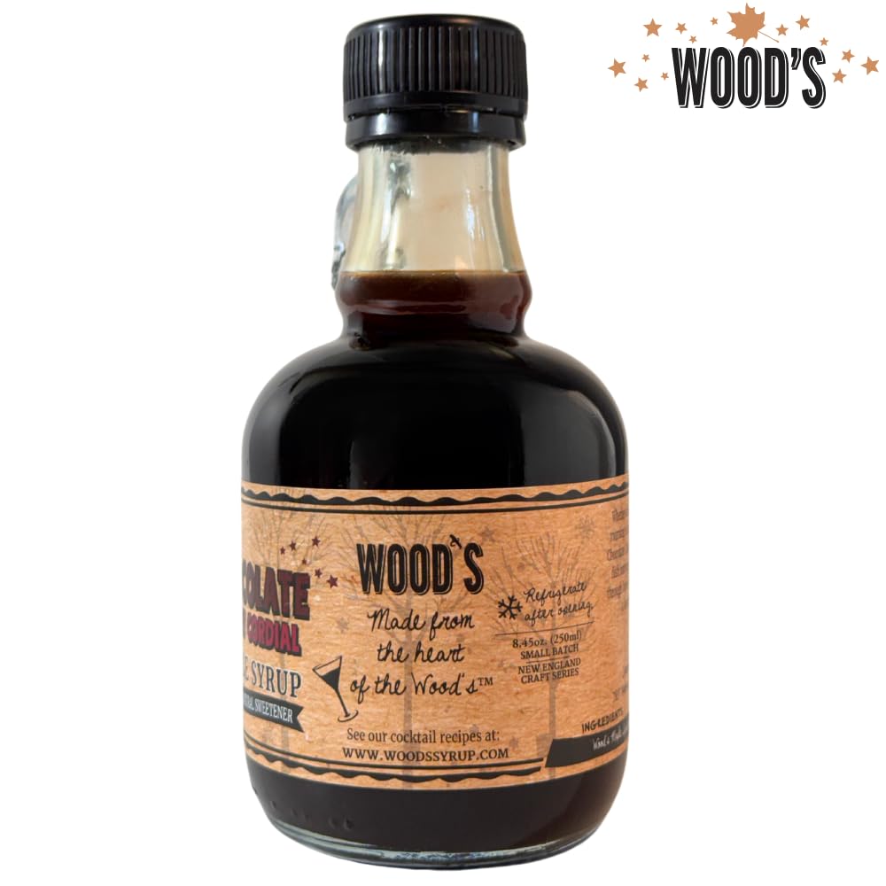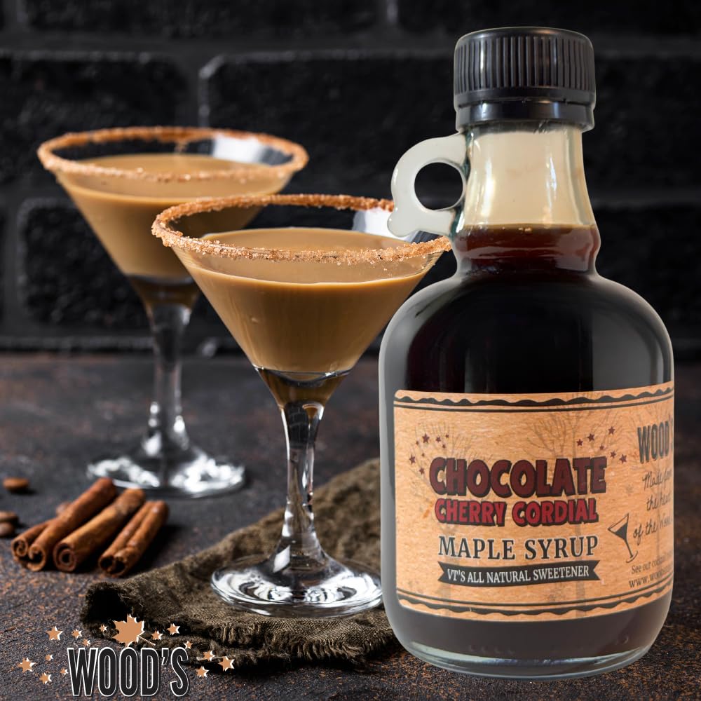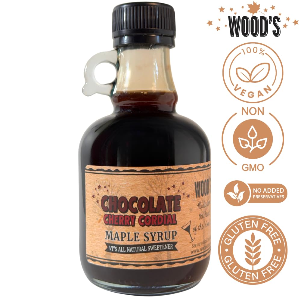 WOOD'S Chocolate Cherry Cordial Infused Maple Syrup – Decadent Vermont Maple Syrup with Dark Cocoa & Succulent Cherries | Small-Batch, All-Natural, Vegan-Friendly Syrup for Breakfast, Desserts & Cocktails | 8.45 Fl Oz