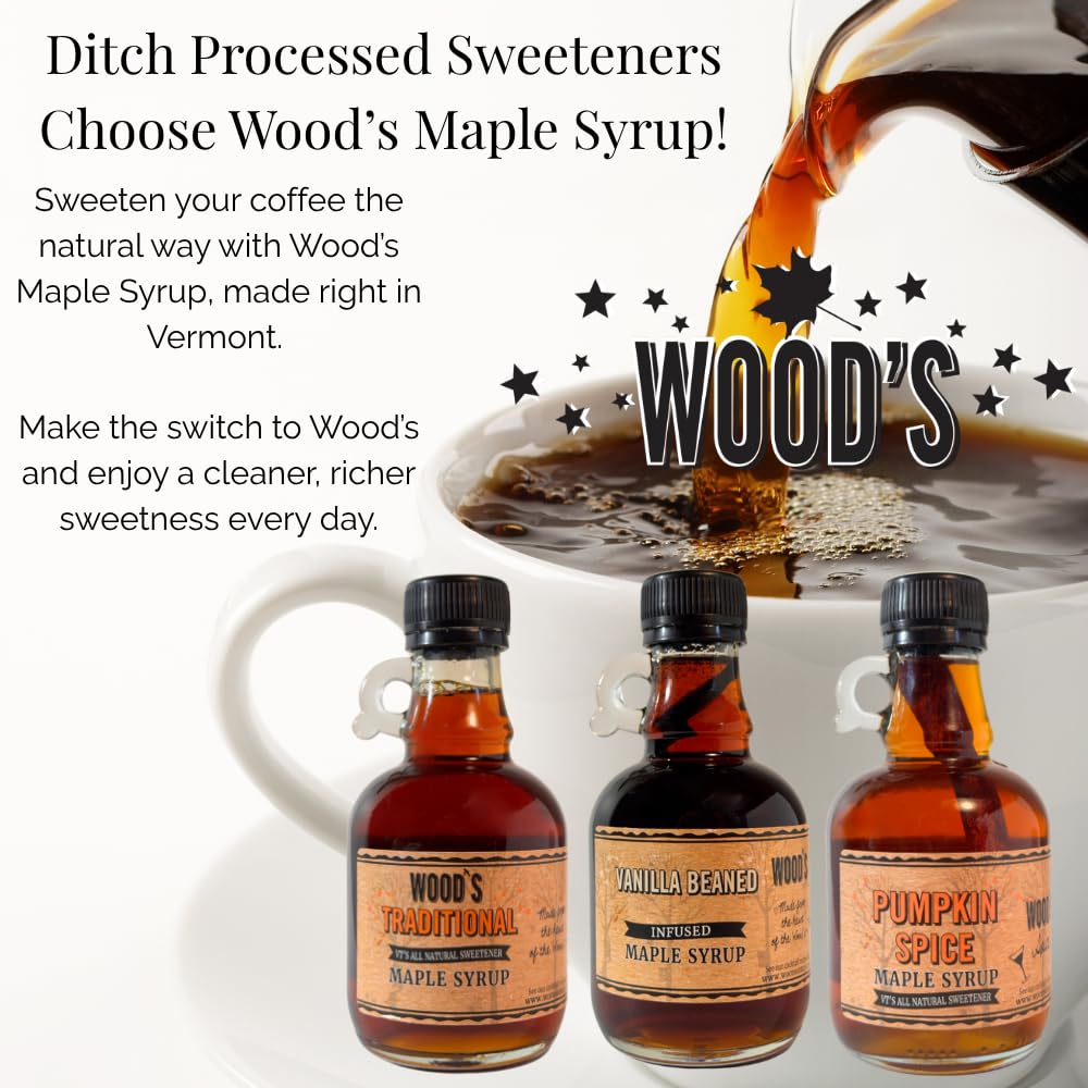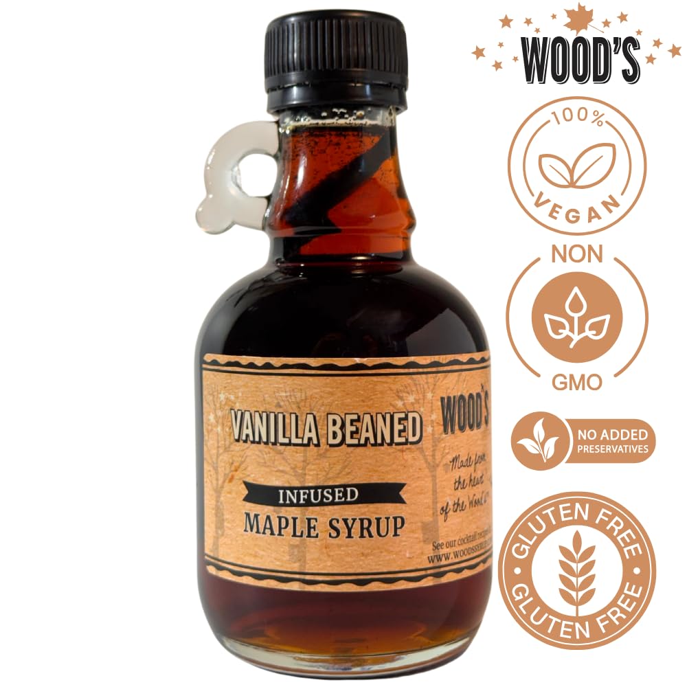 WOOD'S Vanilla Beaned Maple Syrup – Infused Vermont Maple Syrup with Real Vanilla Bean Pod | Smooth, Rich, All-Natural & Vegan Sweetener | Perfect for Breakfast, Baking, Seafood, Popcorn & More | 8.45 Fl Oz (250mL)
