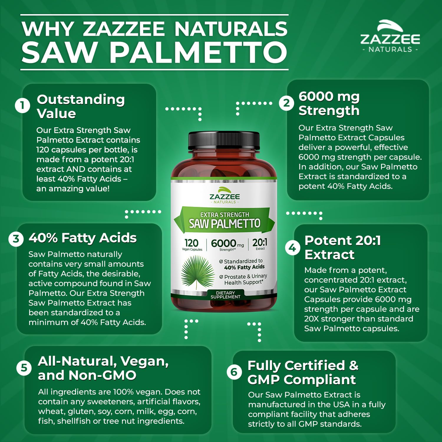 Zazzee Extra Strength Saw Palmetto 20:1 Extract, 6000 mg Strength, 40% Fatty Acids, 120 Vegan Capsules, 4 Month Supply, Concentrated and Standardized 20X Extract, Non-GMO, All-Natural, Made in the USA