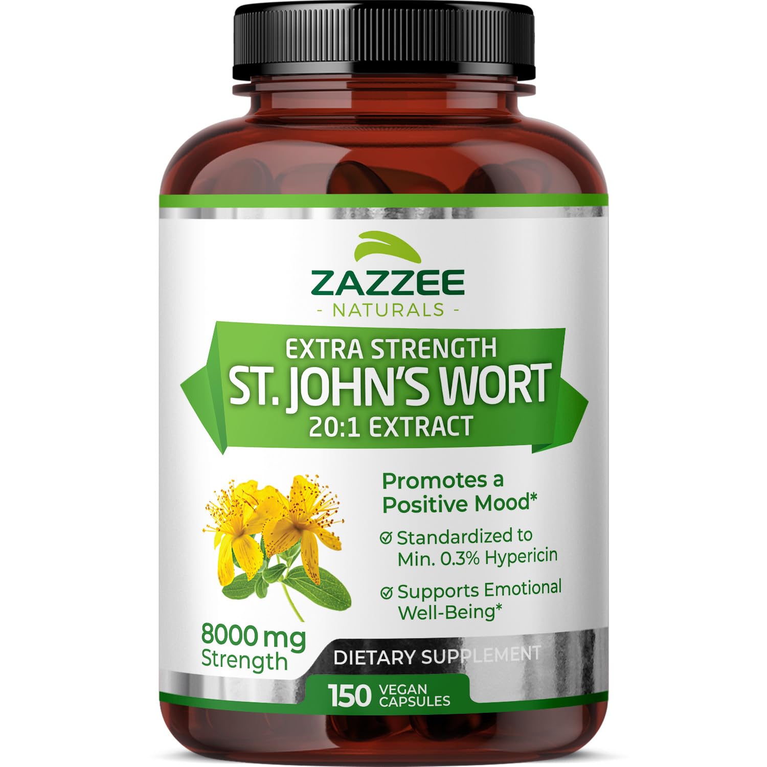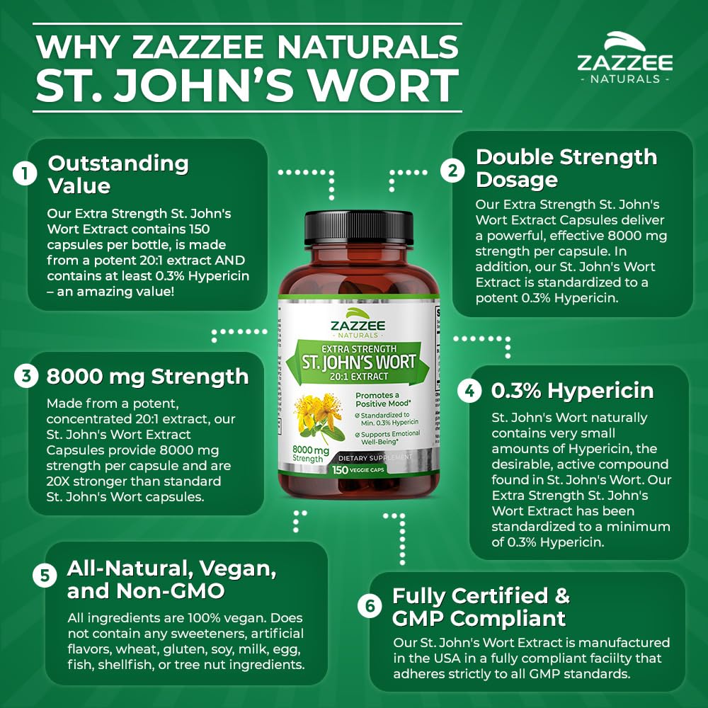 Zazzee Extra Strength St. John’s Wort 20:1 Extract, 8000 mg Strength, 0.3% Hypericin, 150 Vegan Capsules, 5 Month Supply, Concentrated, Standardized 20X Extract, 100% Vegetarian, Non-GMO, All-Natural