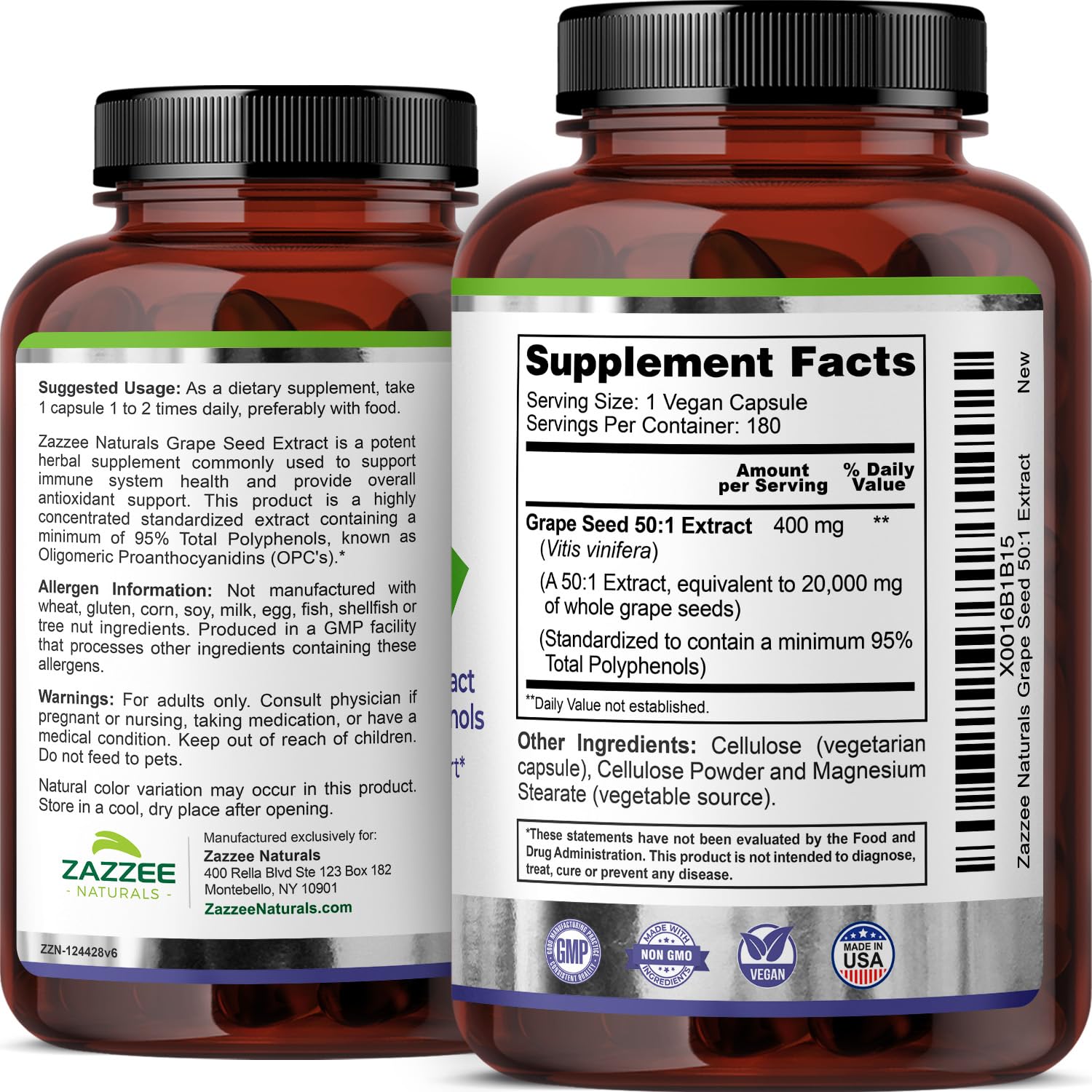 Zazzee High Strength Grape Seed 50:1 Extract, 180 Vegan Capsules, 95% Polyphenols, 400 mg per Capsule, 6 Month Supply, Standardized and Concentrated 50X Extract, Non-GMO, Made in The USA