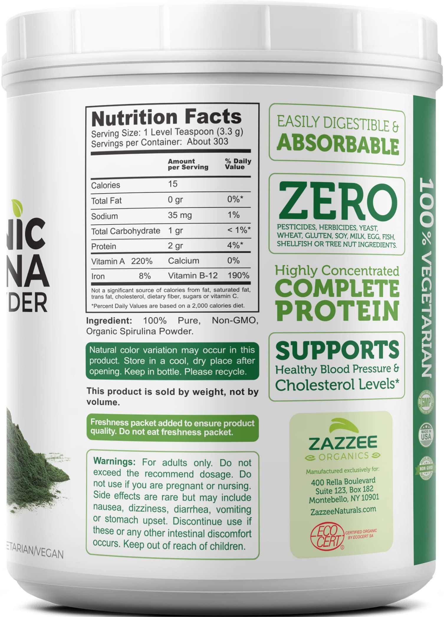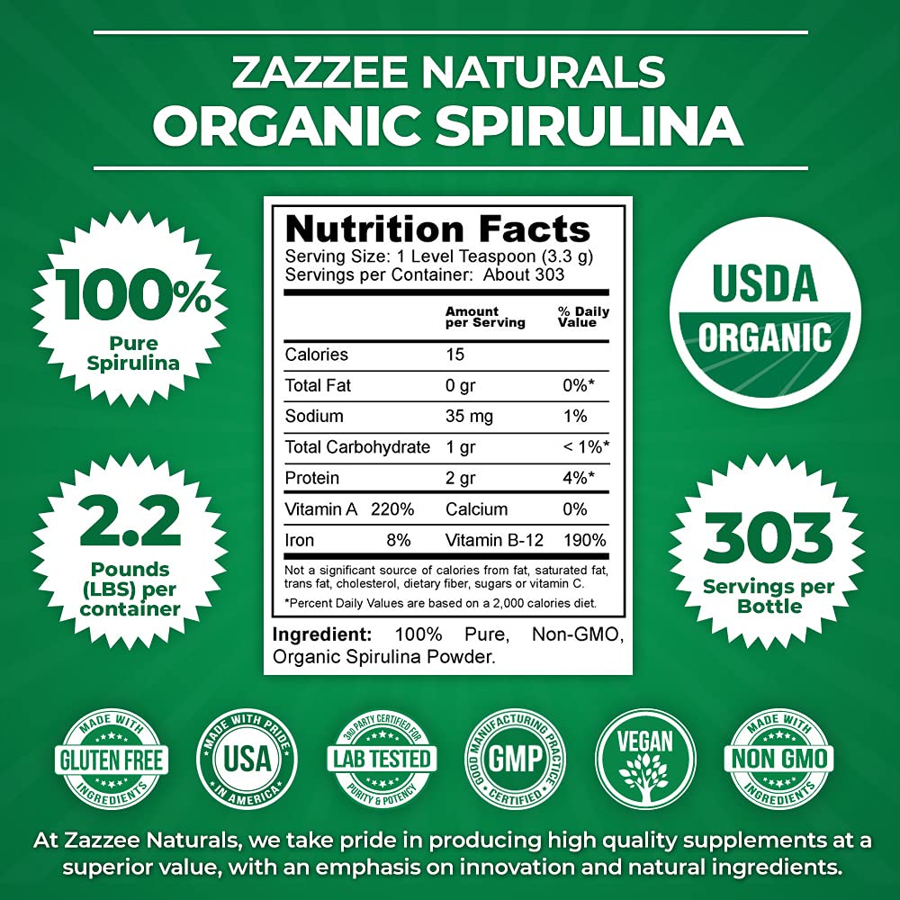 Zazzee Organic Spirulina Powder, 2.2 Pounds (1 KG), USDA Certified, 303 Servings, 100% Pure, Non-Irradiated, Mess-Free Wide Mouth Container, Fresh Smell and Neutral Taste, Vegan, Non-GMO, Gluten-Free