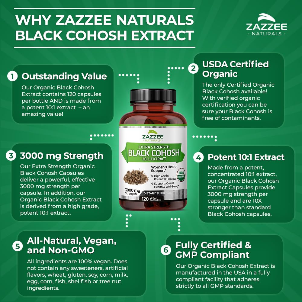 Zazzee USDA Organic Black Cohosh 10:1 Extract, 3000 mg Strength, 120 Vegan Capsules, 4 Month Supply, Standardized and Concentrated 10X Extract, 100% Vegetarian, All-Natural, Non-GMO, Made in The USA