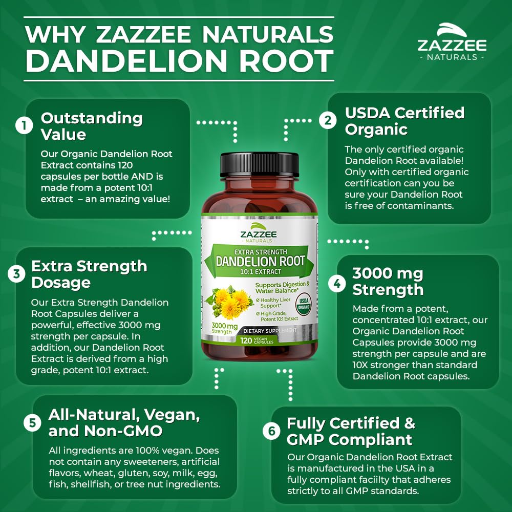Zazzee USDA Organic Dandelion Root 10:1 Extract, 3000 mg Strength, 120 Capsules, 4 Month Supply, Standardized and Concentrated 10X Extract, 100% Vegetarian, All-Natural and Non-GMO