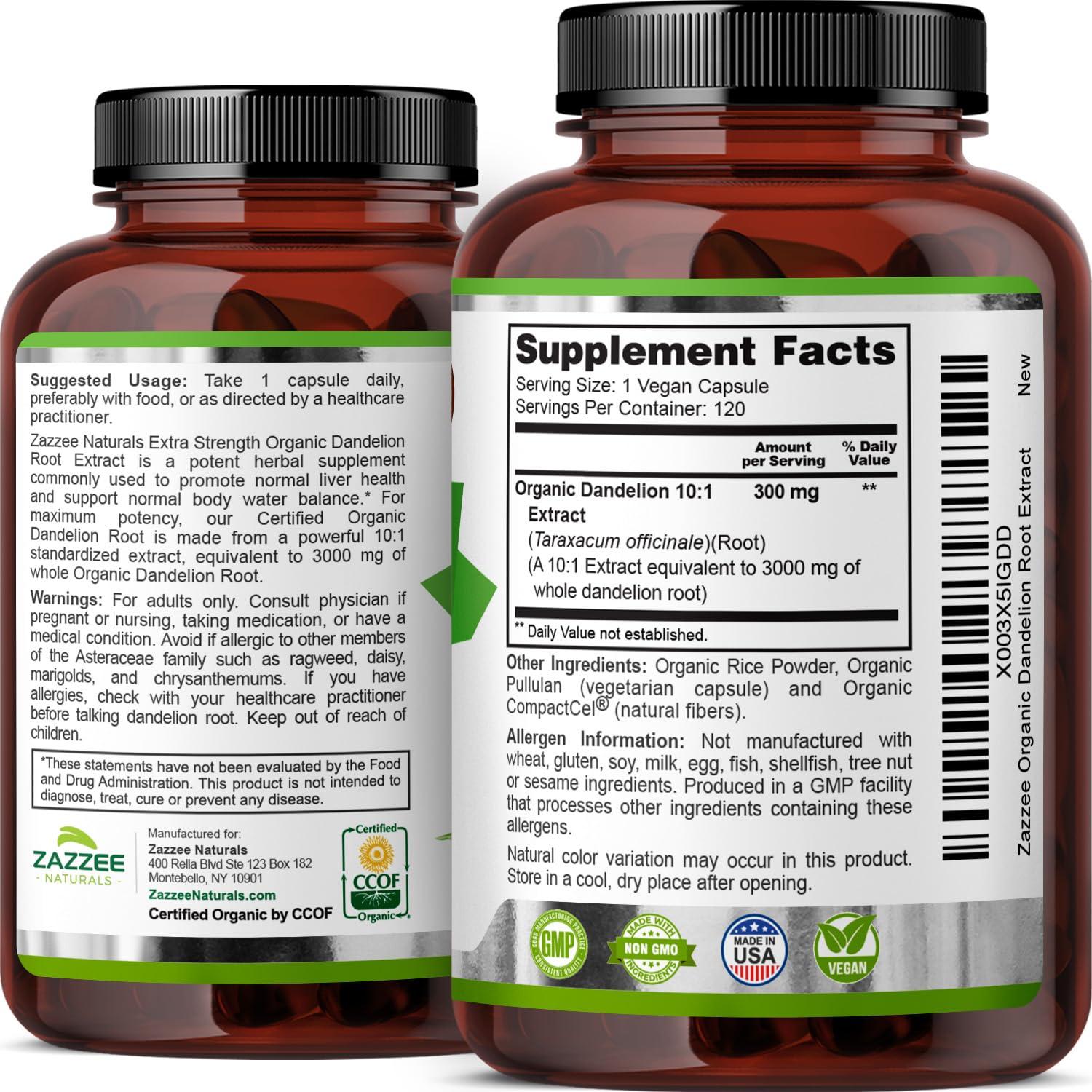 - USDA CERTIFIED ORGANIC: Any Dandelion Root that is not CERTIFIED organic can be highly contaminated and even harmful. With Zazzee Naturals Certified Organic Dandelion Root, you can be sure your Dandelion Root is organic, all-natural, vegan, and non-GMO. More, while other competing products use various chemicals as fillers, binders, and excipients, our Organic Dandelion Root instead uses a unique blend of organic stabilizers.