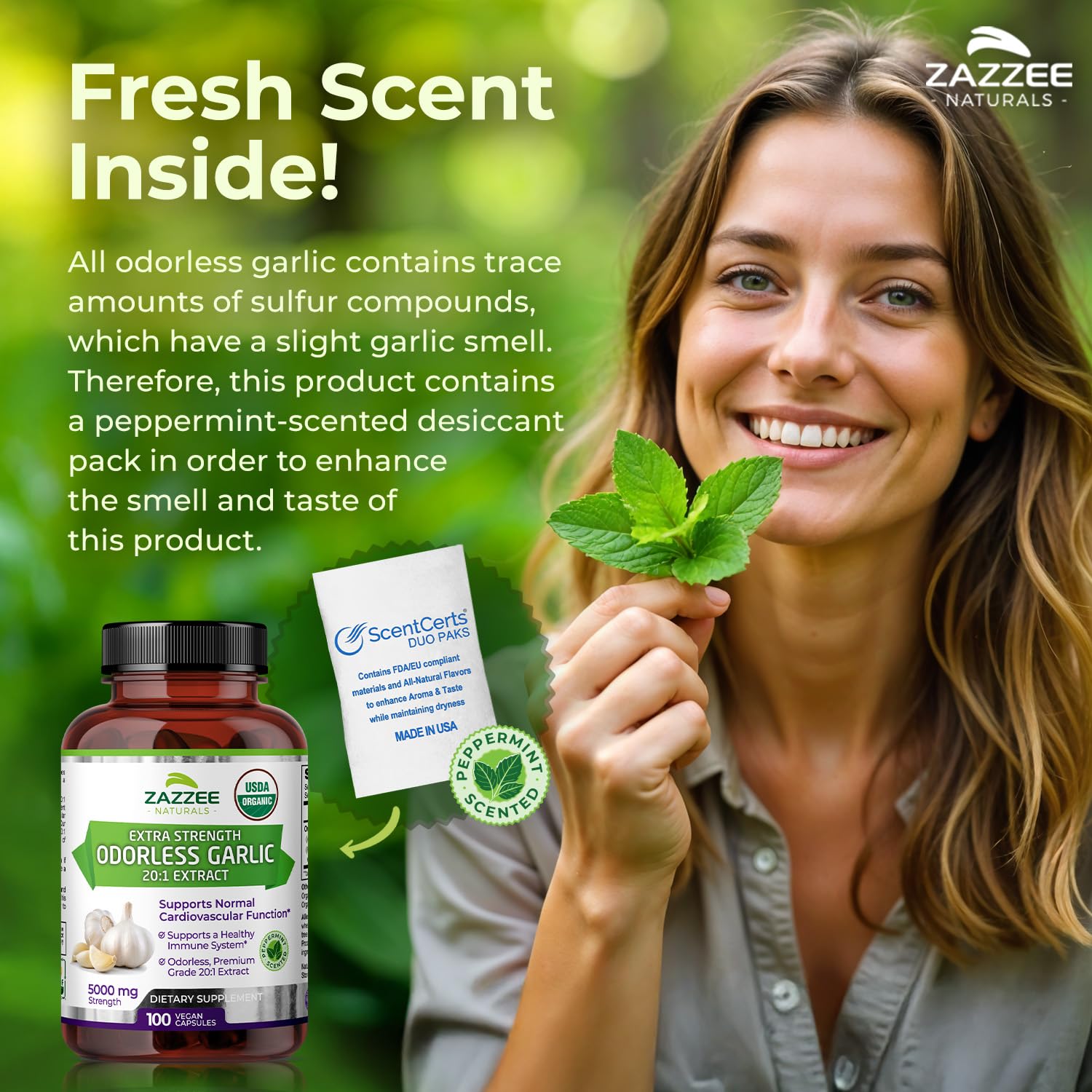 Zazzee USDA Organic Odorless Garlic 20:1 Extract, 5000 mg Strength, 100 Vegan Capsules, 3+ Month Supply, Standardized, Concentrated 20X Extract, 100% Vegetarian, All-Natural, Non-GMO, Made in The USA