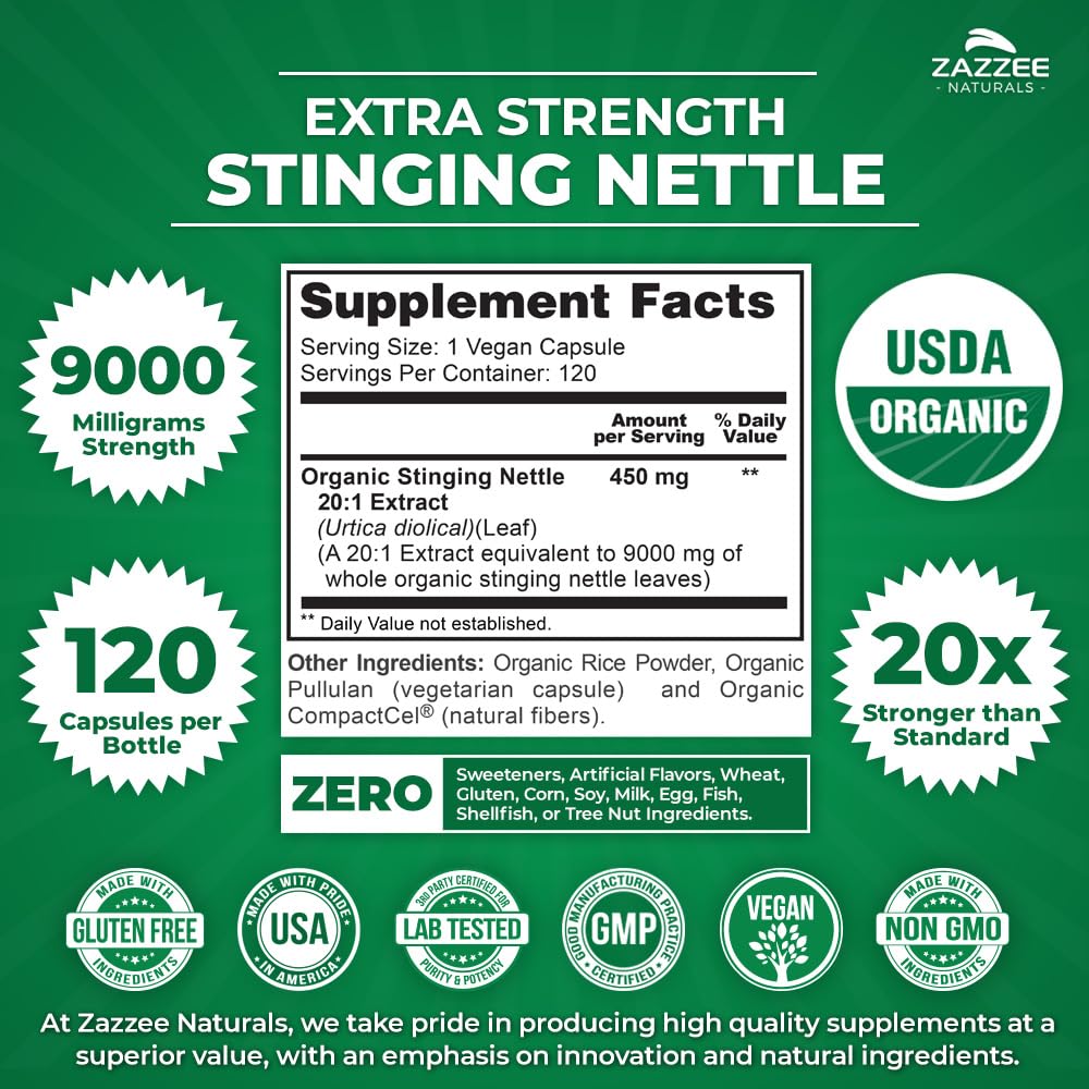- USDA CERTIFIED ORGANIC: Any Stinging Nettle that is not CERTIFIED organic can be highly contaminated and even harmful. With Zazzee Naturals Certified Organic Stinging Nettle, you can be sure your Stinging Nettle is organic, all-natural, vegan, and non-GMO. More, while other competing products use various chemicals as fillers, binders, and excipients, our Organic Stinging Nettle instead uses a unique blend of organic stabilizers.