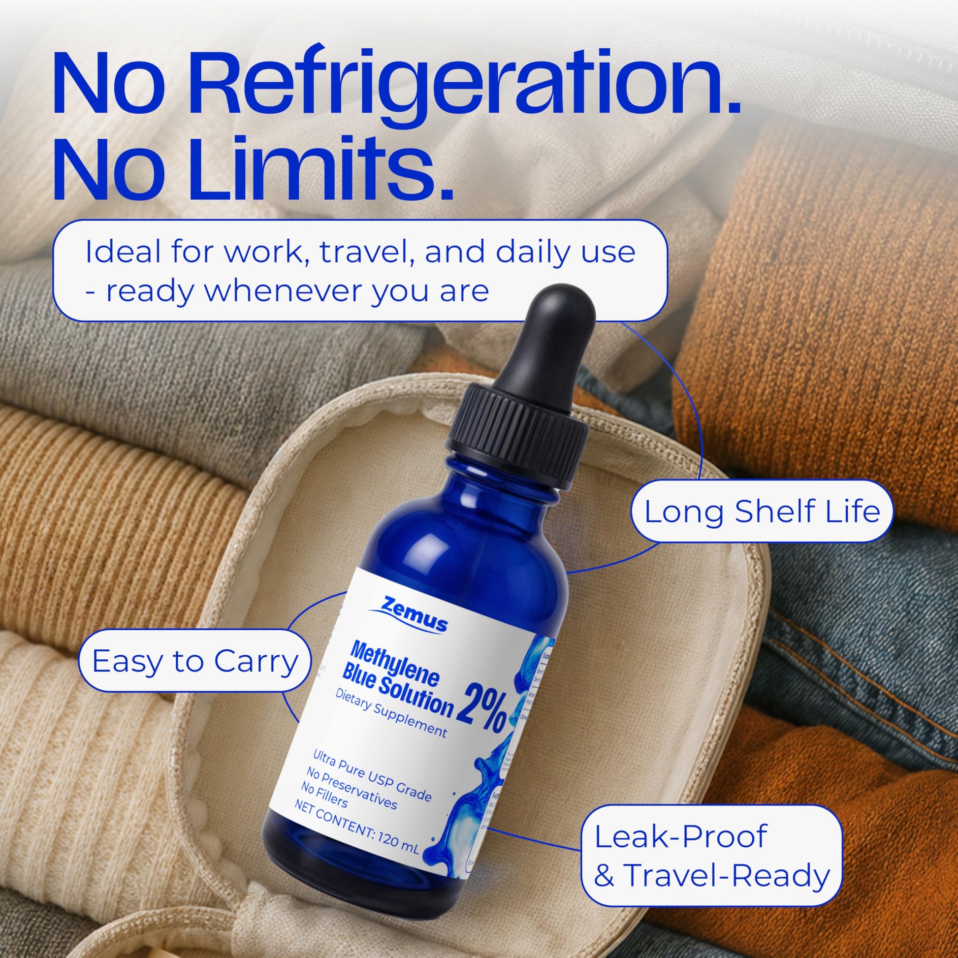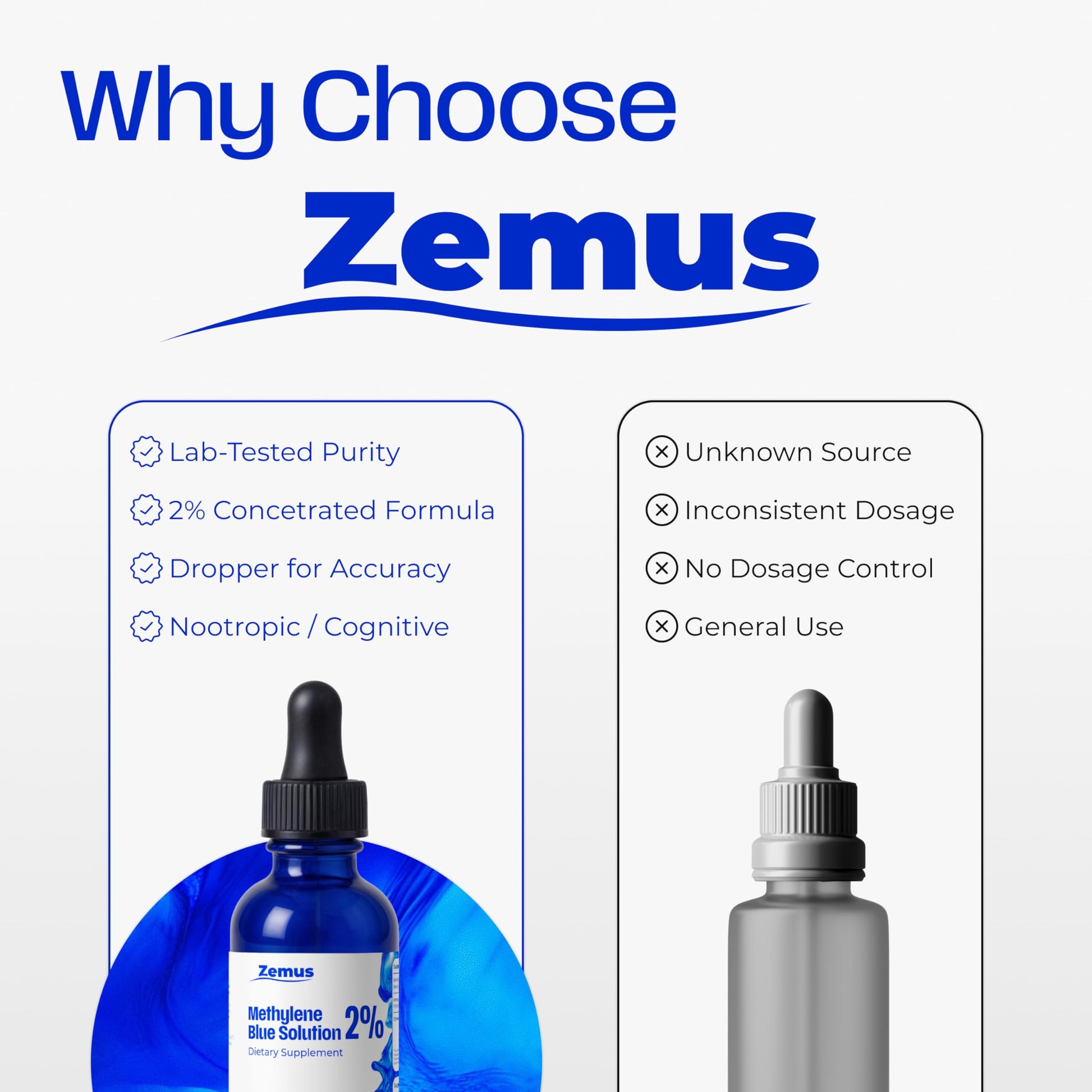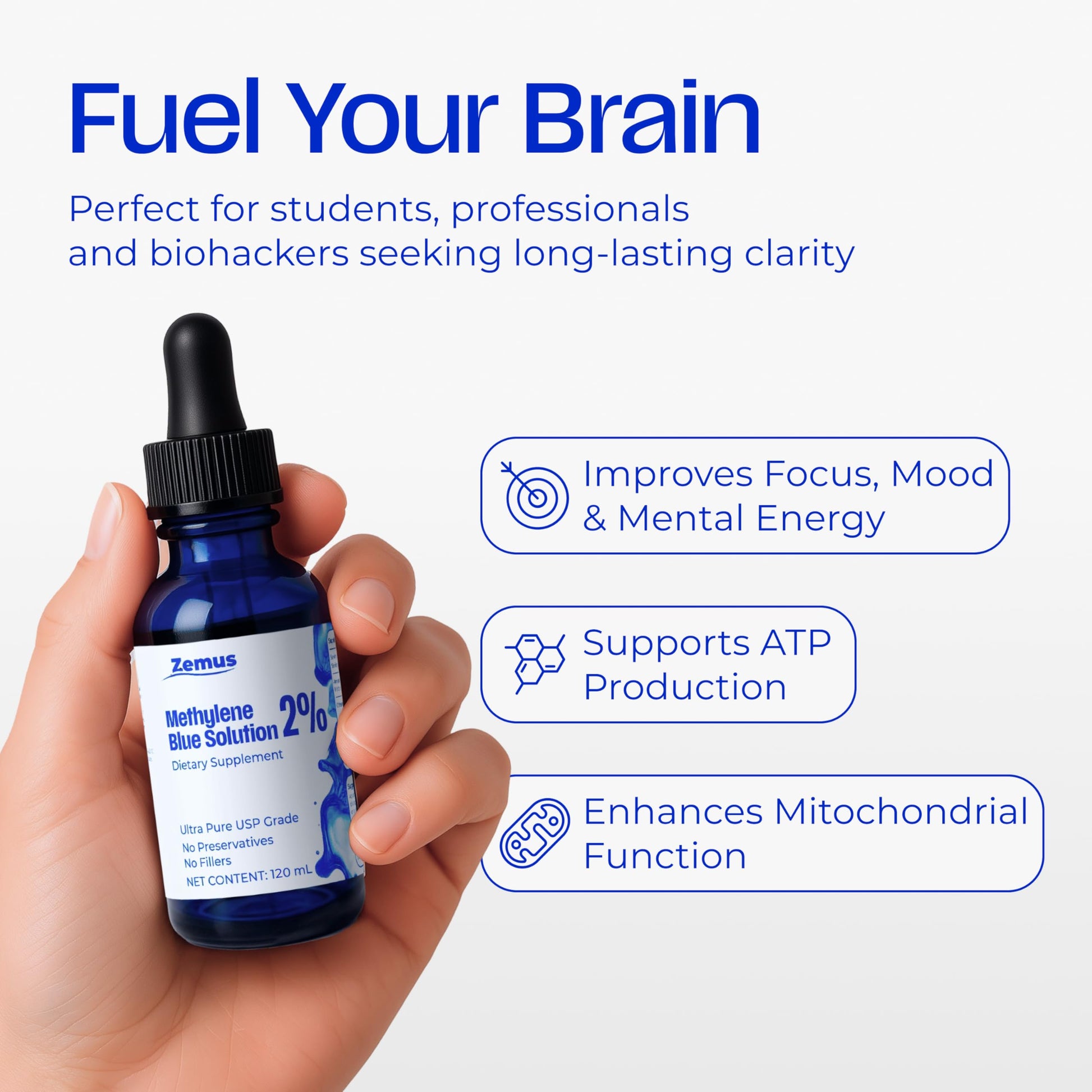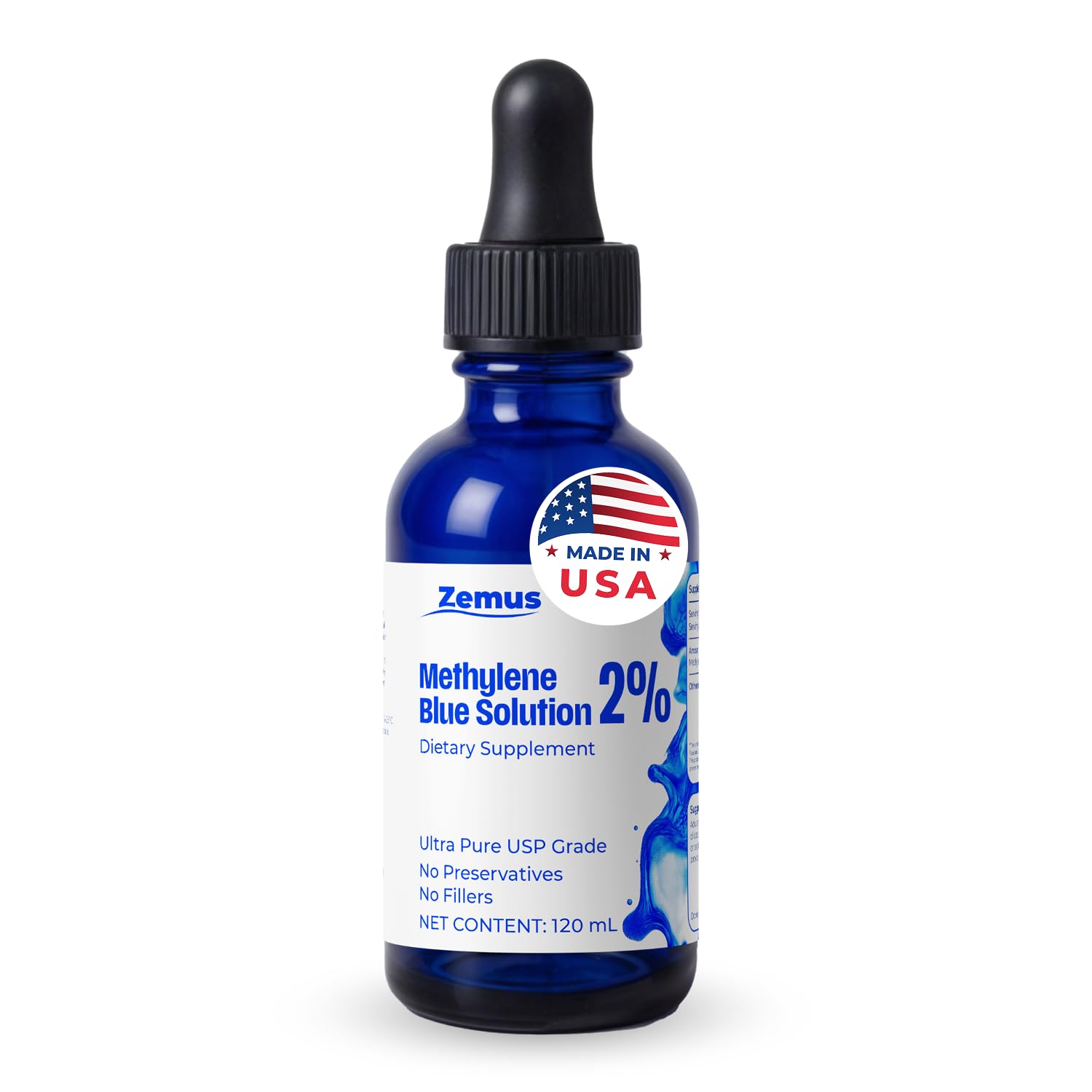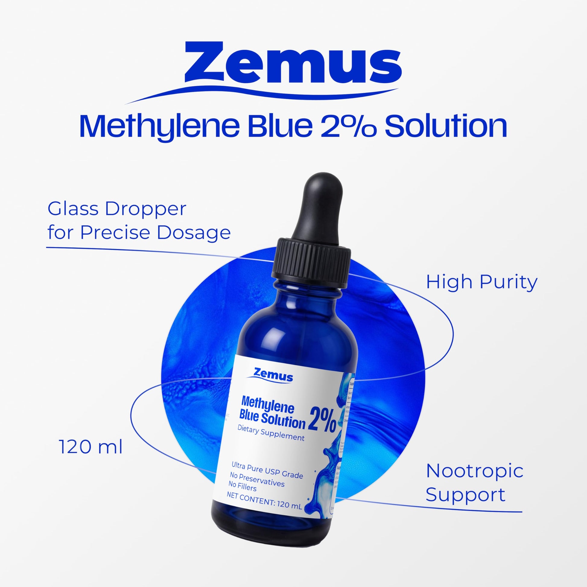 Zemus Methylene Blue 2% – 120 ML (4.06 fl oz) - 120 Day Supply - Nootropic Supplement – Ultra Pure USP Grade, – Made in USA, No Preservatives, Non-Therapeutic, Lab-Tested