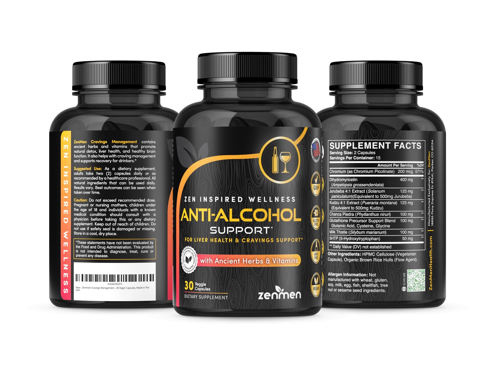 Details: Alcohol disrupts many bodily processes. It encourages fluid loss, which leads to dehydration. It sends mixed messages to the central nervous system. It can even deplete glucose and send your blood sugar plummeting. This is just for starters - the effects are many, and you can feel most of them. All of this adds up to a very bad Day After. Zenmen’s Cravings Support supplement is a gamechanger. Whether you want to look out for your health when imbibing or start cutting out the alcohol altogether, we’ve developed a product packed with superstar ingredients for the job. Dihydromyricetin, also known as DHM, is a derivative of the Japanese raisin tree. Research has indicated that it has some potential protective properties. It bears some similar effects to kudzu, another herbal in our formula that has also been a mainstay in Chinese medicine. Chanca Piedra is another ancient herbal long valued for the support it lends various organs, especially the kidneys. Add in Jurubeba and milk thistle, more historical tonics said to be supportive and cleansing to our internal organs, and you’re on your way to optimal post-alcohol condition. It’s all capped off with the science-based benefits of 5-HTP, which could include mood support and better rest. Zenmen Stop Alcohol Cravings Supplement emphasizes total wellness, from your bodily processes to your outlook on life.